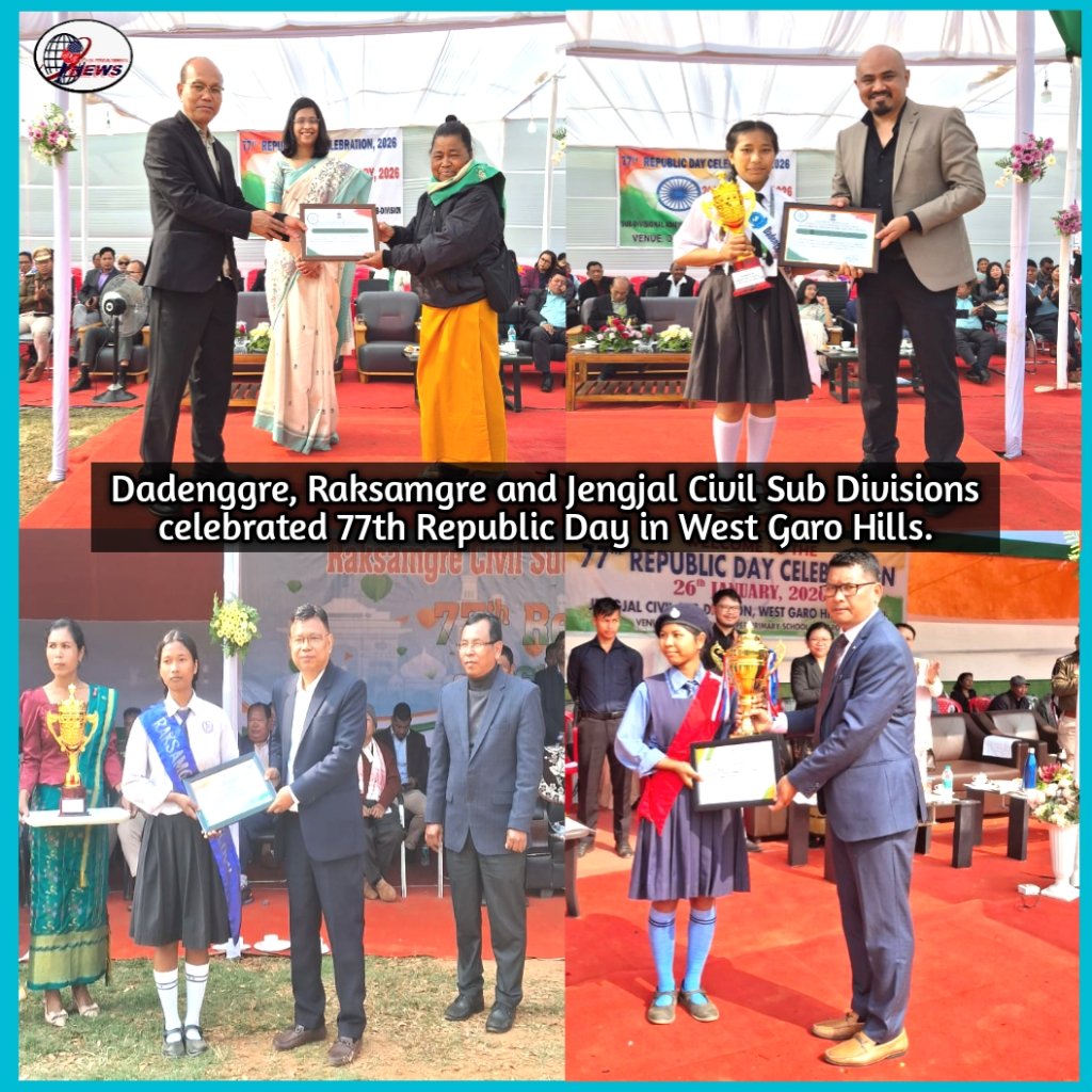 Dadenggre, Jan 26, 2026: The 77th Republic Day in Dadenggre Civil Sub-Division was celebrated at Dadenggre Playground where Limison D Sangma, Deputy Speaker, Meghalaya Legislative Assembly unfurled the National flag and took Rashtriya Salute in the presence of 11 marching contingents comprising of 2nd MLP Battalion Goeragre, Scouts and Guides of Dadenggre Puri Government Higher Secondary School, Tiny Rose Higher Secondary School, Dilsigre Higher Secondary School, Sunrise Higher Secondary School and Little Flower Higher Secondary School.