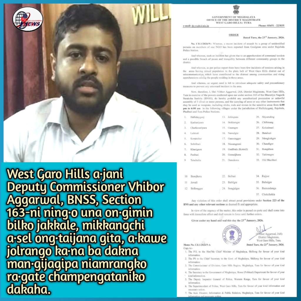 Tura, Jan 23, 2026: Rajabala Pulis Station-ni ning·o donggipa Goalgaon songo a·sel ong·ani ja·man, jatgnini gisepo adita ding·chaogrikanirang ong·katahani gimin, mikkangchi iandakgipa a·selrang ong·gnirangko champengsona gita, West Garo Hills a·jani Deputy Commission Vhibor Aggarwal, BNSS Section 163-ni ning·o una on·gimin bilko jakkale, a·kawe jolni adita biaprango dakna man·gijagipa niamrangko ra·gate champenganirangko dakataha.